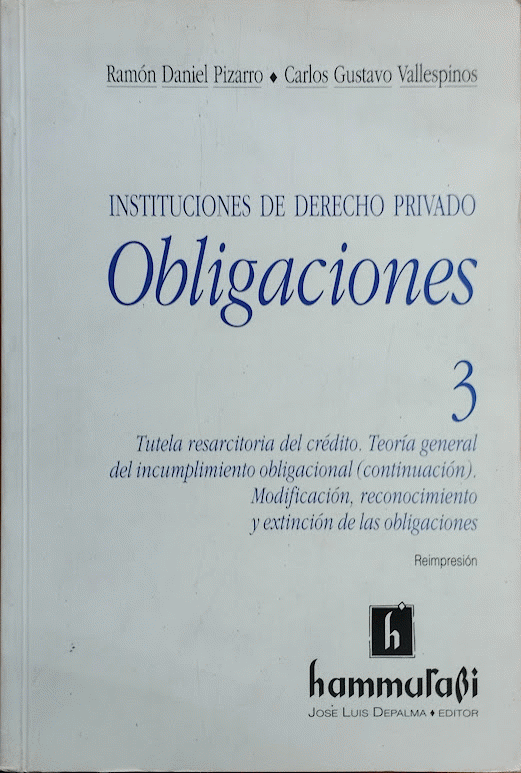 Instituciones de derecho privado. Obligaciones 3 : Tutela resarcitoria del crédito. Teoría general del incumplimiento obligacional (cont.). Modificación, reconocimiento y extinción de las obligaciones / Ramón Daniel Pizarro, Carlos Gustavo Vallespinos ; colaboradora, Angélica Jure de Obeide.
